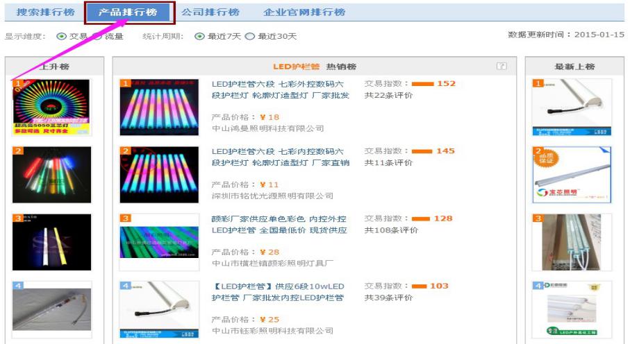 如果产品销量不高,可能就找不到自家的产品,销量高的或许能找到自己的产品。这里需要说明的是:产品排行榜分交易、流量及7天、30天。我们常看到很多人会看交易且是7天的。