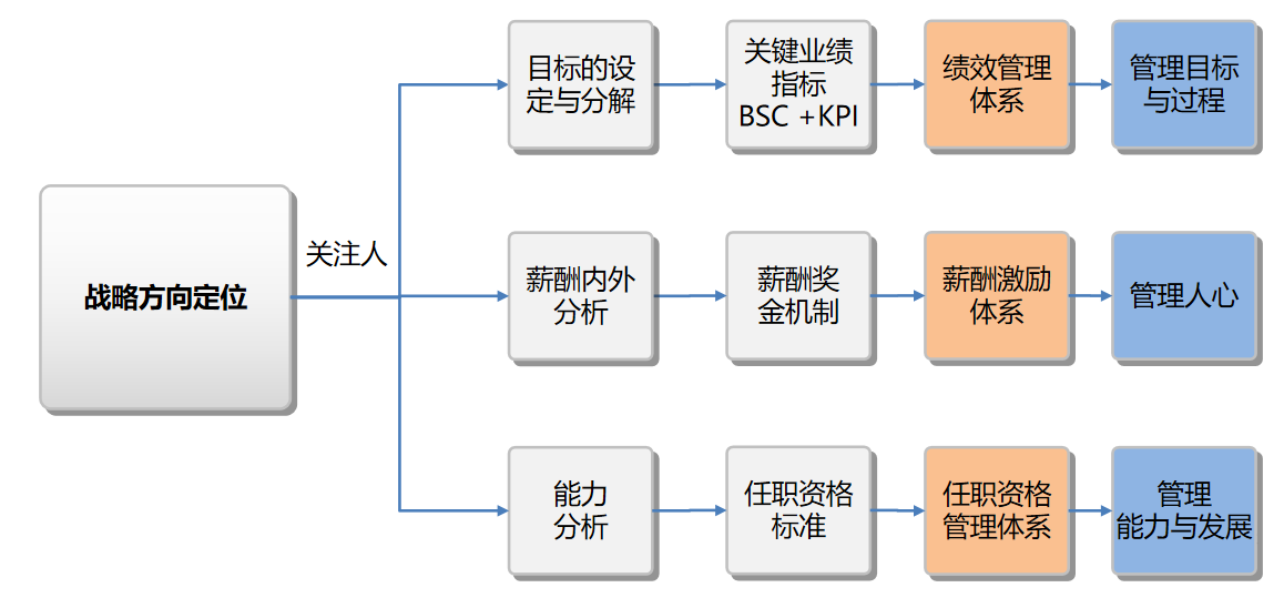 回顾AT大数据调研诊断的管理问题,任职资格体系现阶段对企业非常重要,因为战略的实现,需要任职资格管理体系、绩效管理体系、薪酬管理体系分别从管理能力、管理目标、管理人心的方面支撑公司战略目标达成。