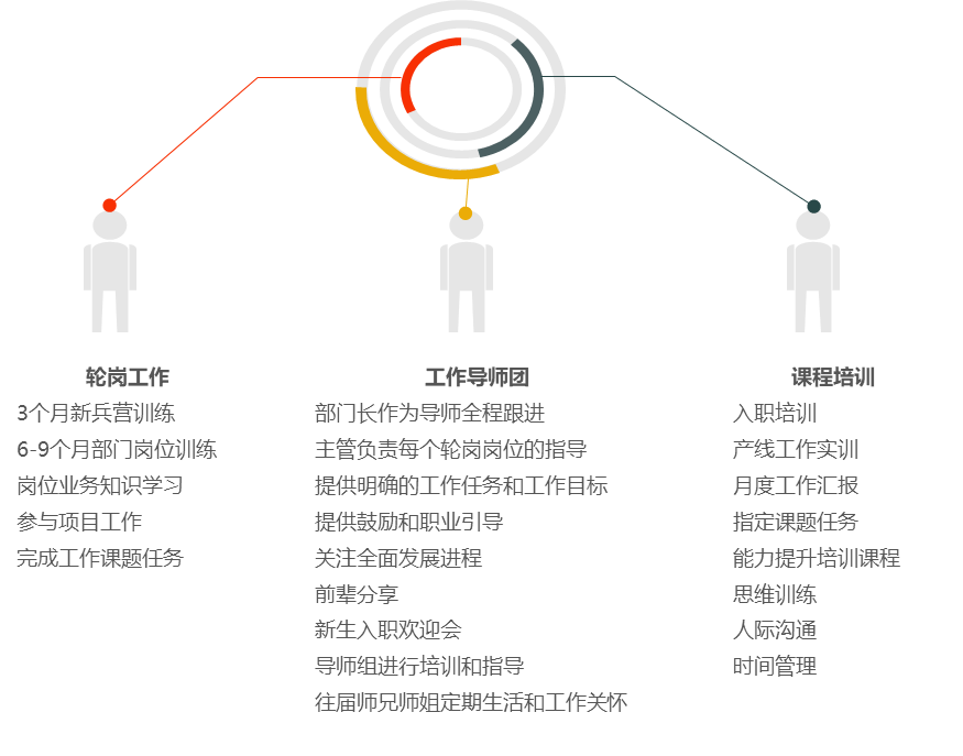 培训生的来源为应届毕业生,他们对于职场更像一张白纸,对于职场文化、冲突管理的认知还不足,如果直接放置到各个部门,对培养结果的保证力就削弱许多。集中式培养一是更好地协调培训资源,保证培训生群体在资源享受上的一致性;二是可以更适合培养出组织所需的未来干部,在组织的价值观认可度上更高;三是集中式培养一般采取脱产培训,可以避免部门放养式培养,或者“操作工”式培养,无法让培训生的长处得到更好的配置与发展,带来人才退化或人才流失的问题。