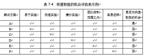 如表 7-4 所示,解决方案只有同时满足易于实施、快速实施、廉价实施、团队控制范围之内和容易逆转五个条件才是快速取胜的机会,即有一个或一个以上不符合条件的都不算快速取胜的机会。快速取胜机会的评估标准,如表 7-5 所示。