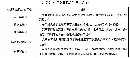 值活动,并审视这些活动是否有优化空间。有些流程由于长期执行,易使人员形成“存在即合理”的惯性思维,难以发现不妥之处。这时,只要绘制一张简单的流程现状图,就有可能发现许多明显的改进点,这类改进通常被称为快速取胜的机会(或快赢项目)。如何判断是否为快速取胜的机会呢?可以通过快速取胜的机会评估表快速判断,如表 7-4 所示。