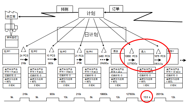 车间价值流图分析的一个主要目的是分析库存高低,一般库存高的地方就是存在问题的地方。可以按工序展开绘图,然后到现场统计各道工序之间的库存。有一个公式:LITTLE RUE说明了交期和库存的关系。