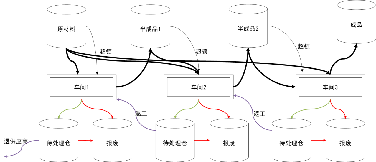 相对于各环节的存量,每一个进出动作都要有合法的依据和工单归属,不允许无依据的进出操作。比如原材料出库依靠计划人员开出的领料单,超领物料则需要对损耗有责任的相关人员进行审批,并标识出超领的归属订单,进入待处理仓或报废仓则需要相关的质量判断凭据,待处理仓出库则需要返修单等。
