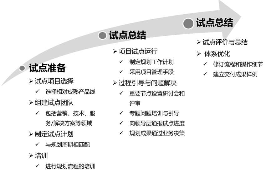 1 | 试点项目选择 | 选择比较成熟的、主打的产品线,有利于规划工作开展,规划成果也容易被认可 新兴产品线,处于寻求市场突破口的阶段,对规划要求高且不确定性大,不宜作为试点对象 |