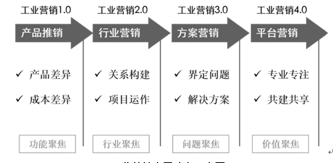 工业营销的发展大致经历了工业营销1.0——产品推销、工业营销2.0——行业营销、工业营销3.0——方案营销和工业营销4.0——平台营销四个阶段,如下图所示。