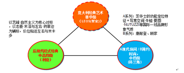 利豪定位于中高档产品,分三大品牌运作,不仅要对产品风格做出清晰界定,更要确定对标品牌、价位空间、市场策略、目标人群、主要材料、产品组合等,以更好地将风格展现出来,更好地彰显不同品牌内涵!