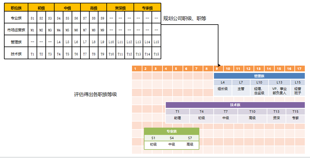 选择方法:可选的方法有:(1)排序法、(2)职位归类法、(3)评分法、(4)穿插法;常用的方法(1)先用评分法评估典型职位、(2)再用穿插法将其他职位归入职级表。