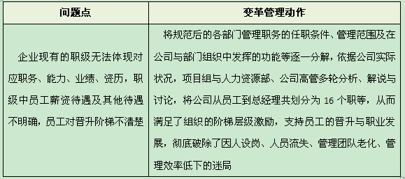 :所以,将规范后的各部门管理职务的任职条件、管理范围及在公司与部门组织中发挥的功能等逐一分解。依据公司实际状况,项目组与人力资源部、公司高管多轮分析、解说与讨论,将公司从员工到总经理共划分为16个职等,从而满足了组织的阶梯层级激励,支持员工的晋升与职业发展,彻底破除了因人设岗、人员流失、管理团队老化、管理效率低下的问题。