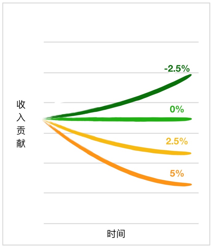 • 第二条线:客户成功刚步入正轨,客户扩展带来的收入恰好和客户流失的收入损失持平,所以流失率为0,收入贡献保持不变。