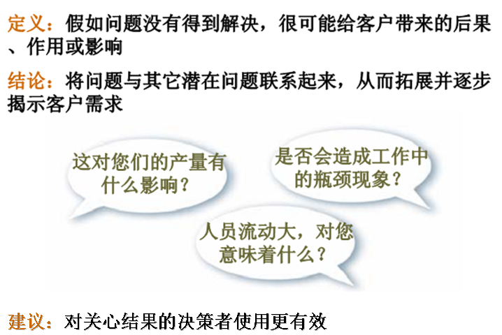 什么是后果型提问?就是假如问题、困难没有得到解决,给客户带来的后果、作用或影响。问题型提问好像你捅了客户一刀让他感到有点痛苦,但没有撕心裂肺,要继续扩大痛苦,还得在伤口上撒把盐,后果型提问就是撒盐。比如因为工人上岗培训要花太多的时间,会不会造成工作中的瓶颈?对产量有什么影响?工作环境恶劣、噪声大,会不会导致人员流动率高,是不是加剧了操作工人短缺的问题?