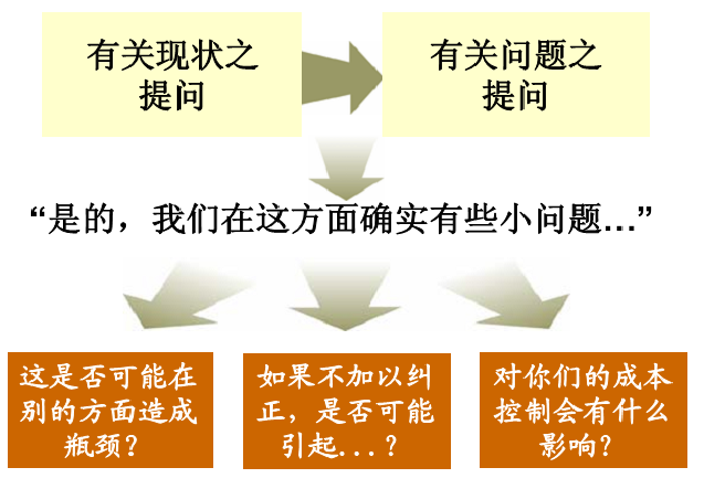 问题型提问和后果型提问有比较明显的逻辑关系,前者是向客户指出存在问题,后者是提醒对方问题导致的严重后果。后果型提问是问题型提问的升级版,把一般的问题升级为严重的问题、把小概率事件升级成大概率的事件。目的就是要让客户不要犹豫,促使他立刻购买,因为不购买的后果很严重,后果型提问对关心结果的决策者使用更有效。下面我们还是用斯贝尔的实际案例来说明后果型的提问: