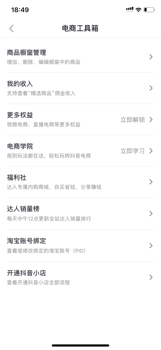 在“商品橱窗”的“电商工具箱申请”解锁“视频电商权限”。15天内,发布2条以上包含商品的视频,就可以获得视频电商权限。粉丝超过3000+,并且开通了视频电商权限,就可以直接获得直播电商权限,可以在视频、直播中卖货挣钱。