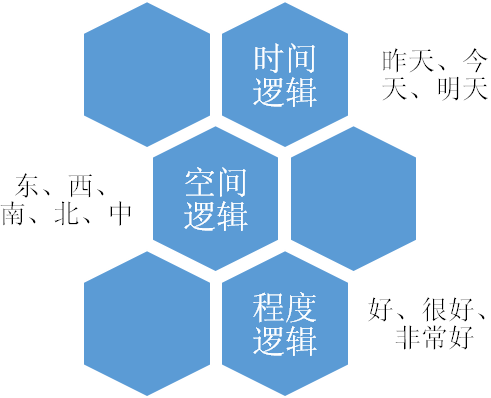 三是要有建模。结合事实发现规律。为方便传承,我们需要将事实按照一定的逻辑进行提炼,通常情况有三种逻辑进行建模:时间逻辑,如过去、现在和未来,昨天、今天和明天;空间逻辑,如你、我、他,上、中、下;程度逻辑,如好、很好、非常好,快、很快、非常快。如图2-5所示。