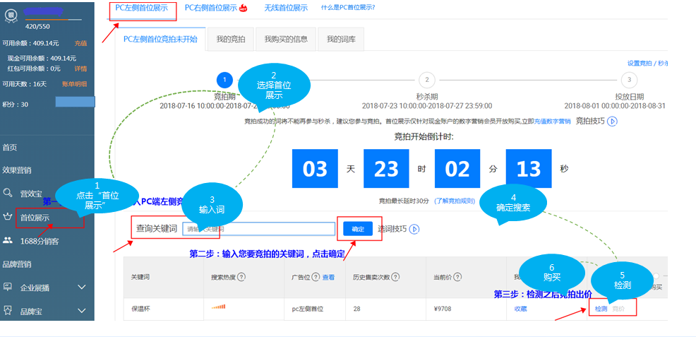 首位展示共3个位置:PC端左侧第一位、PC右侧第一位、无线端首页第一位。每个位置分别售卖。购买规则&时间:PC右侧第一位与PC左侧第一位是一致的。