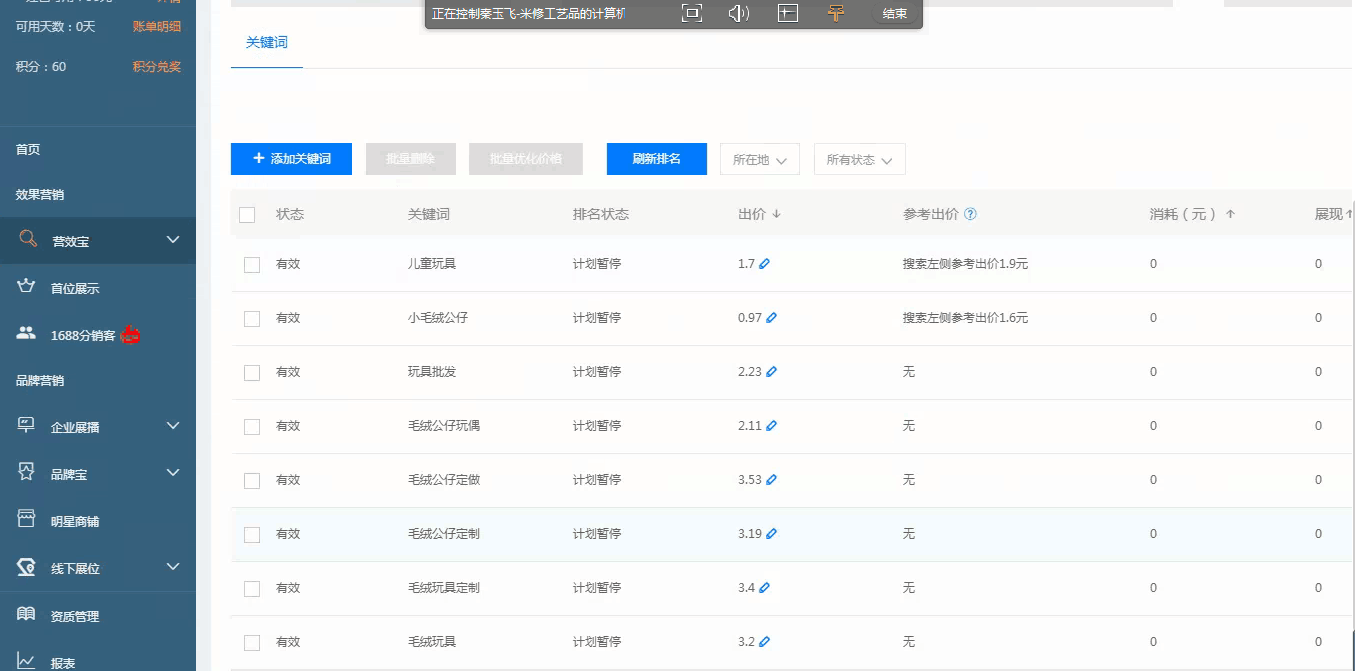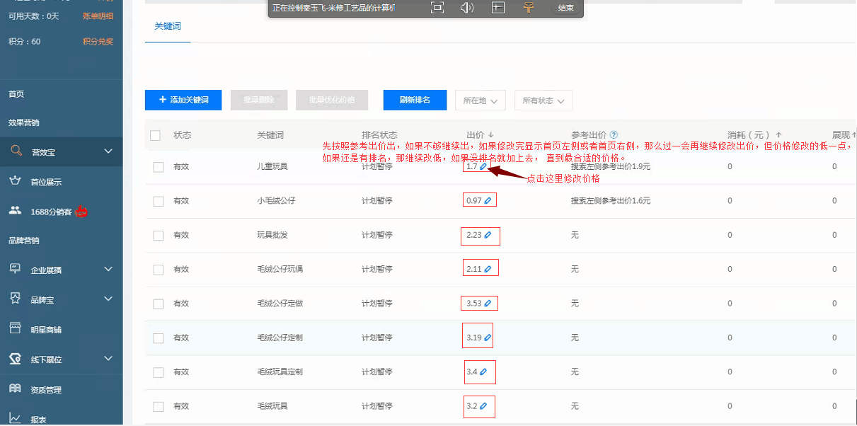 点开关键词然后看参考出价,比如“儿童玩具”参考出价是1.9元,那么我们修改出价为1.9元看是否有排名?如果显示首页左侧排名多少位,那我们就将价格改为1.85元看是否有排名?如果有排名则继续修改价格为1.8元,如果还有排名就继续降。如果没有排名我们按照刚刚的顺序反过来操作,也就是1.8元加到1.85元看排名,如果没有继续加,加到1.9元。如果还没排名,继续加到1.95元或者2.0元。注意细节:这里需要经常修改,因为竞争对手一直在动,只有动才能省钱。(还有些最新操作技法没办法在书面完成,需要了解的可联系笔者索取详细视频版)。