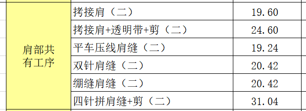 那么,在每类款式的衣服中,会有相同的工序,也会有不同的工序,还会有相似的工序,就比如:T恤系列,肩部有很多种做法,这个IE就负责T恤系列所有工序的标准工时的测定。肩部的工序有:拷接肩、拷接肩+透明带+剪(二)、平车压线肩缝(二)、双针肩缝(二)、绷缝肩缝(二)、四针拼肩缝+剪(二)。