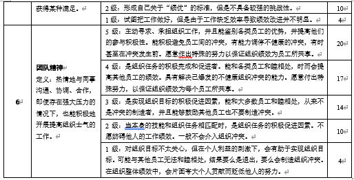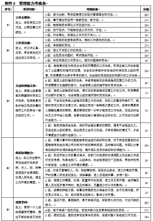 5级:主动寻求、承担组织工作,并且能鉴别各类员工的优势,并提高他们的参与积极性。能积极避免员工间的冲突,有能力调停不健康的冲突,有时甚至在冲突发生前。愿意作出特殊的努力以保证组织绩效为员工所共享。