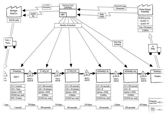 价值流程图Value Steam Map:从宏观角度观察和描绘产品的信息流和物流,从供应商到生产厂家,再到客户的所有流程和路径的图,包括现状图和未来图(丰田称之为物料和信息流图)。