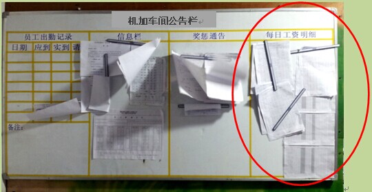 许多实施计件制的企业,常常出现员工因为不清楚工资的计算过程和结果而产生疑问、不满和抱怨。而广东某企业的这类问题就不多,一个重要原因就是该企业每天将员工工资以目视化管理的方式公示,如图2-18所示。