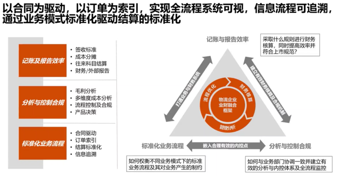 推动业财融合是以数据支撑物流决策的重要举措,在流程性企业中,业财融合的主要挑战来自三个方面:记账及报告效率、分析与风控合规,以及标准化业务流程。实现业财融合的重点在于构建符合该企业的分析模型,包括但不限于毛利、潜赢潜亏、库发增利、运费测算和预算等。如图6-12所示。