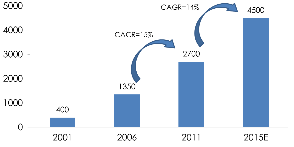 2008年以来,中国商业地产投资一直保持15%以上的增长态势,特别是2010年住宅调控政策颁布后,商业地产投资增速达到30%,高于房地产行业平均投资增速。截至2012年9月,中国商业用房施工面积为6亿平方米。一般商业地产施工需要2~3年建成,目前在建的项目将在2015年左右集中释放,未来商业地产市场饱和度还将提升,竞争持续加剧。
