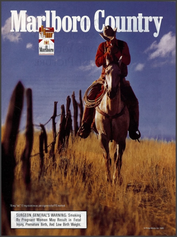 万宝路香烟结合当时的美国文化,以充分体现男人挽救力的牛仔作为广告形象,将产品由原来的女士香烟重新定位为男士香烟。包装采用当时首创的平开式盒盖技术,并将名称的标准字(MARLBORO)尖角化,使之更富有男性的刚强,并以红色作为外盒主要色彩。万宝路香烟的广告以辽阔的美国西部为背景,塑造了一群狂放不羁、自由豪放、浪漫潇洒的美国西部牛仔的个性形象:一个目光深沉、皮肤粗糙、浑身散发着粗犷、豪气的英雄男子汉,在广告中袖管高高卷起,露出多毛的手臂,手指总是夹着一支冉冉冒烟的“万宝路”香烟。