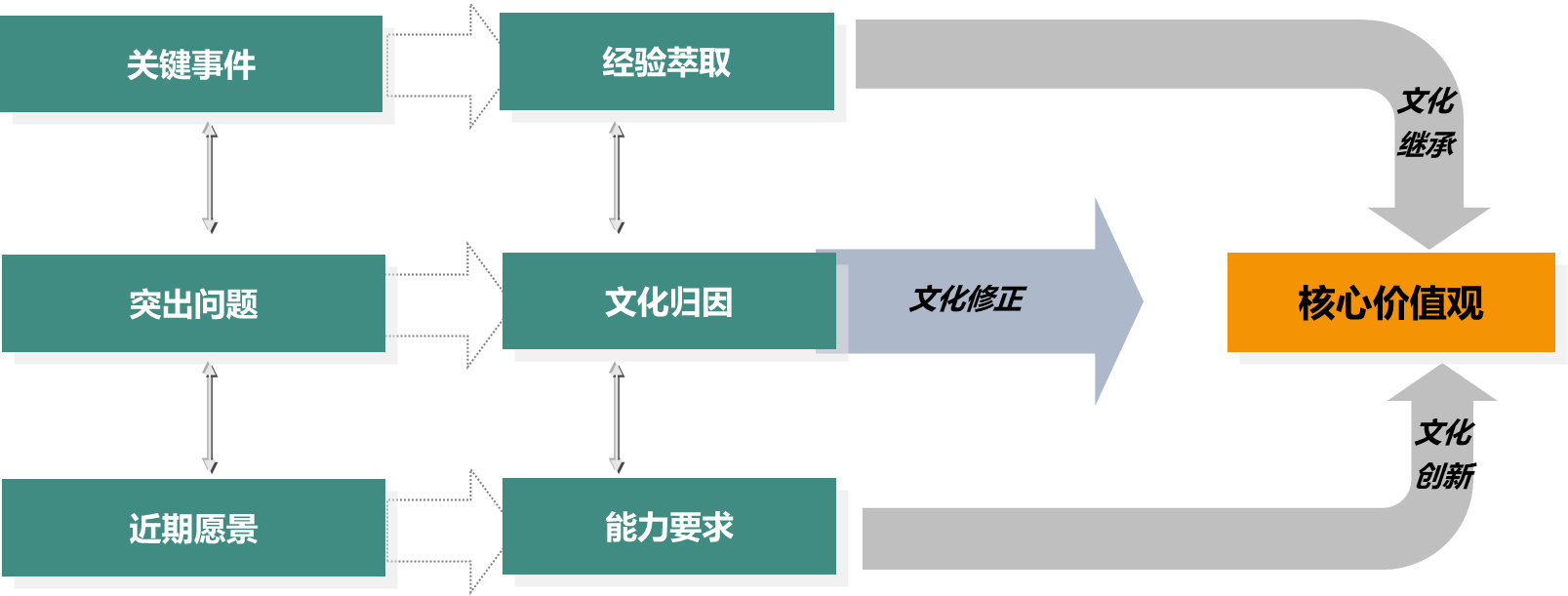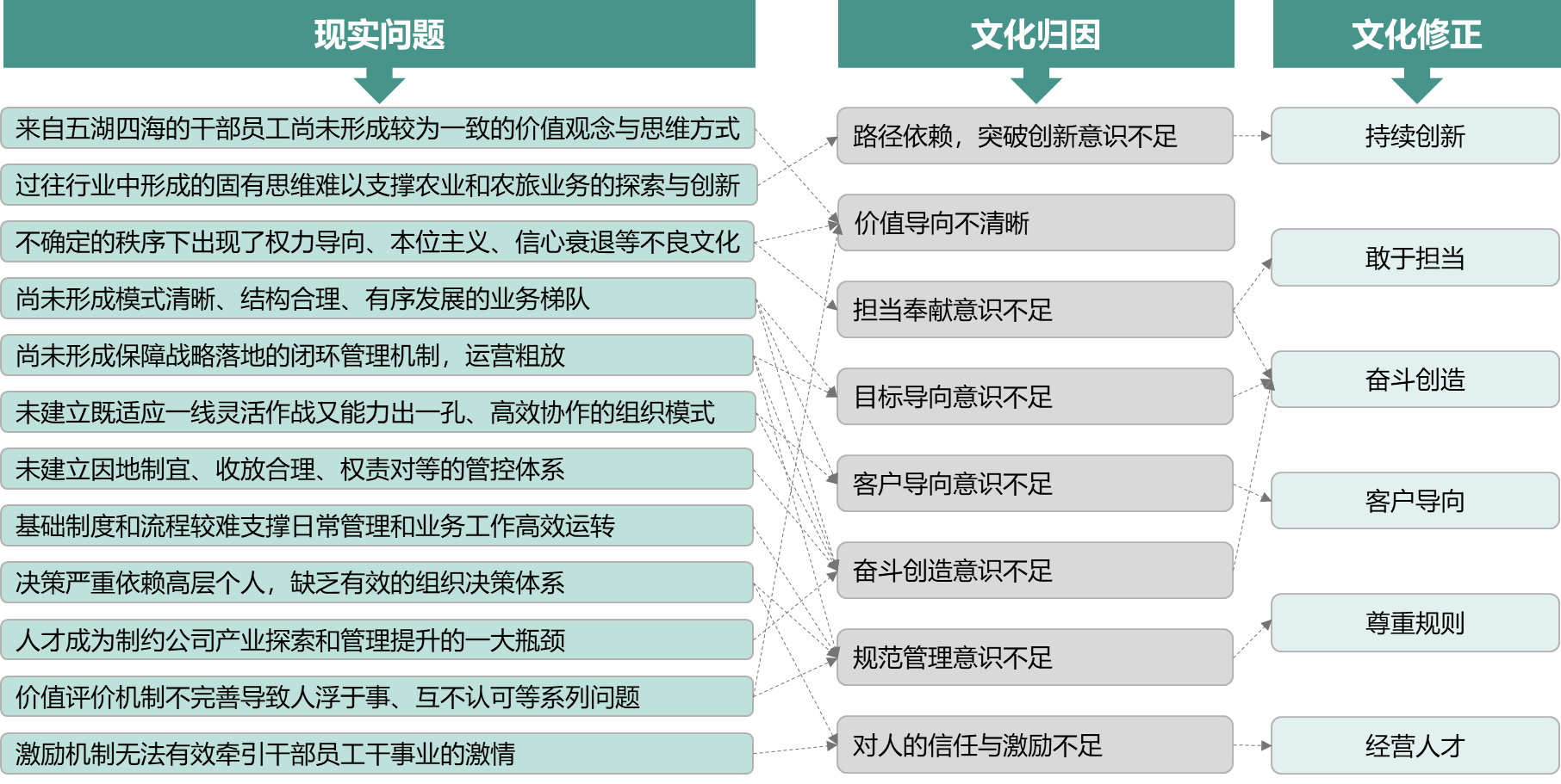 企业往前发展,必须解决当前的问题,尤其是那些突出问题、主要矛盾,这就要求文化上做出相应的修正。因此,在梳理企业价值观时要找出问题和问题背后的文化归因,有针对性地进行文化改进。如图4-12所示。