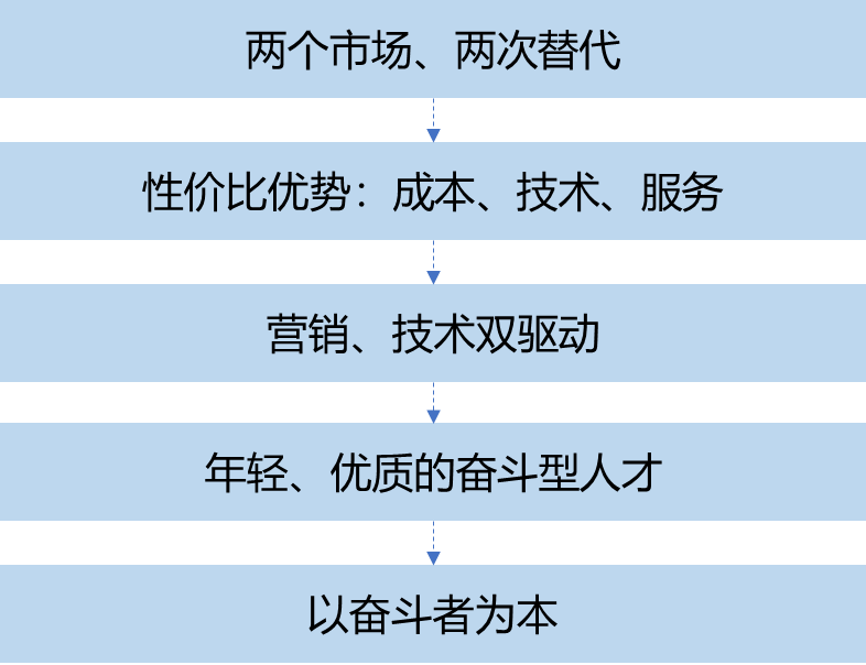 华为通信管道业务曾制定了“两个市场、两次替代”的目标,即先在国内市场,后在国际市场,对国外产品进行替代。那么,依靠什么替代?成本、技术、服务综合最优的性价比优势。优势如何形成?营销、技术双轮驱动,在缺少核心技术的情况下,先从满足顾客需求的应用技术入手,同时提高营销服务水平。优势来源于何处?年轻、有才能、具有“奋斗”精神的人才队伍。打造这样的人才队伍需要什么样的文化?以奋斗者为本,招募愿意奋斗的人,并在薪酬、奖金、福利、荣誉等价值分配方面向奋斗者倾斜。25