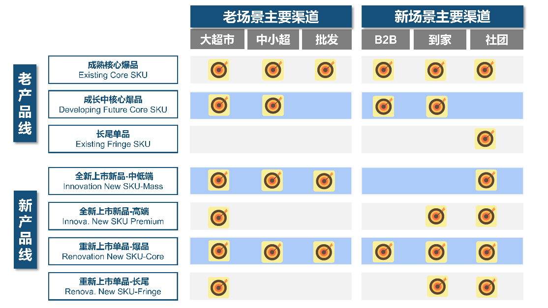 因此,老产品线中的长尾单品、新产品线中的全新上市新品-高端、重新上市单品-长尾无需考虑。而成熟爆品和成长中的核心爆品,则要重仓BC场、重仓中小超市。