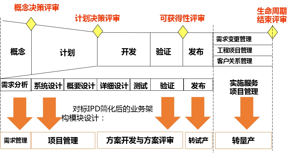我们参考华为的IPD(集成产品开发)管理思想:IPD(集成产品开发)就是要解决产品开发中的过程管理,它其实是以项目管理为框架将产品开发分为概念、计划、设计、开发、验证、发布几个明确的阶段,通过各阶段明确的、规范化的流程来管理研发过程,从而实现研发流程应该创造的价值。