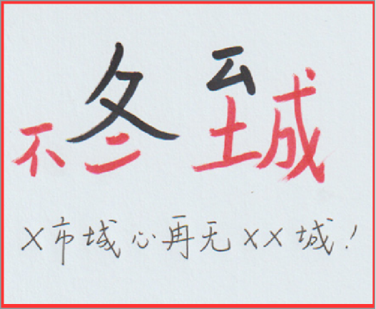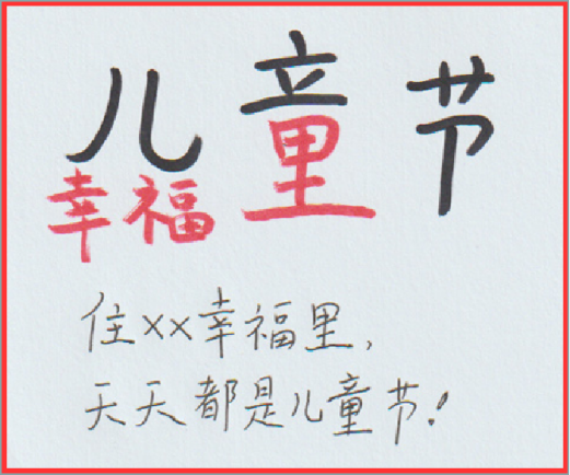 将节气/节日名称进行部首或笔画“拆解”,再将我们的品牌名、广告语、销售信息与它们做一个融合。参考下列设计手稿:图5-3对“儿童节”的“童”字进行部首拆解,植入了项目案名“幸福里”;图5-4对“冬至”二字进行了拆解,融入了广告语“不二城”,表达项目的稀缺性。