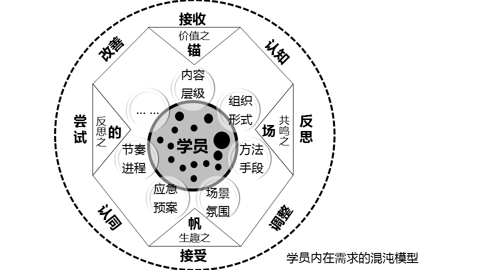 将上述关于“混沌”的解释迁移到学员内在需求的描述上来,指学员在参与培训的学习过程中,各种需求正是处于这样“混沌”的状态。包括: