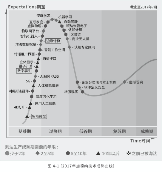 2017年7月,美国加德纳(Gartner )咨询公司,依照往年的惯例,推出了“2017年加德纳技术成熟度曲线”。在曲线的前段,出现了3个新的、并不起眼的新技术名词。加德纳技术曲线上有很多技术名词,包括我们耳熟能详、声名显赫的区块链、人工智能、大数据、云计算等。因此,这3个新的概念和提法,显然没有人会过多地留意到。它们是:智能微尘、数字孪生、边缘计算。(如图4-1所示)