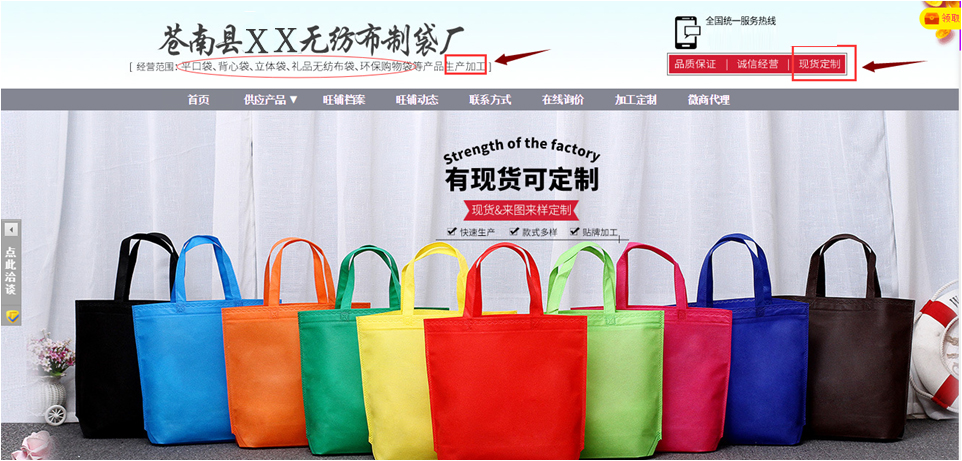 以上两个案例是否符合上述标准?第一个案例,它的市场主要是跨境专供,写的定位文字是:专注生产无纺布袋。这是否是一个正确的定位呢?答案是:NO!第二个案例,一看就知道这家店铺以生产加工为主,并且以背心袋、立体袋、礼品无纺布袋等产品的加工为主。所以这两个都不算标准的定位案例。我们来看看一个常规的标准案例,如图1-2所示。