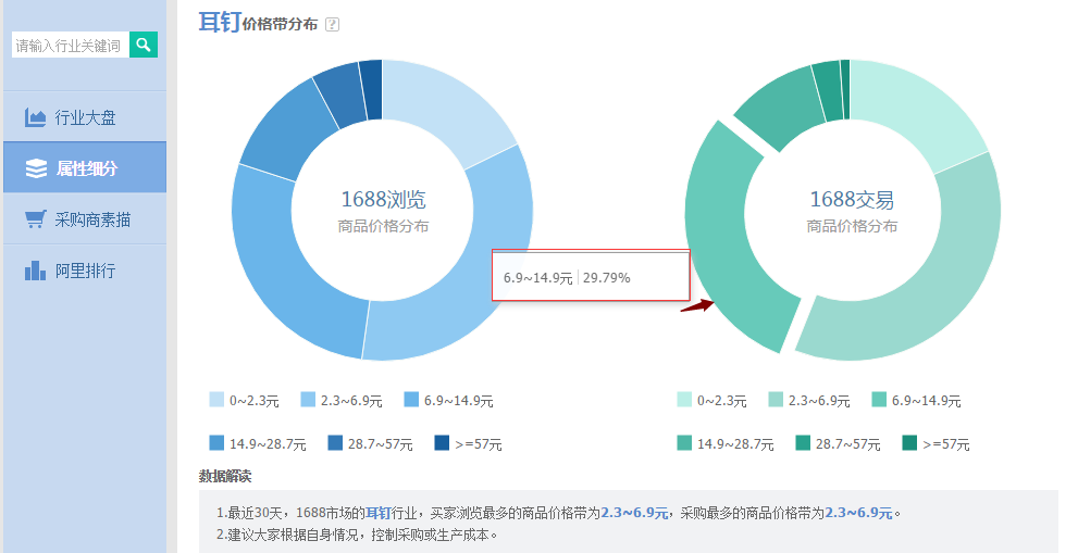 我们来看阿里指数里面的属性细分,得出:30天耳钉行业类别为耳饰。如图1-5所示。