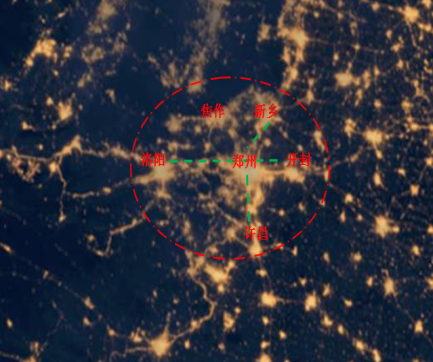 从卫星灯光图中可以看出,中原城市群是以郑州为核心的城市群。目前已初步形成了北至新乡、焦作,东至开封,西至洛阳,南至许昌的大都市圈。