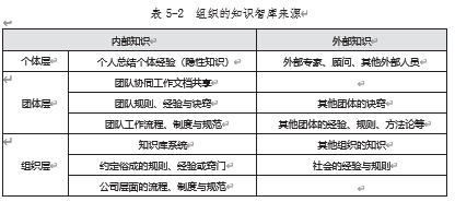 在实际的经营过程中,企业往往更关注货币资本,最忽略知识资本,这也是企业做了那么多的培训或咨询仍会一地鸡毛的原因。组织的知识智库来源分为内部知识和外部知识两大块,同时又可以从个体层、团队层和组织层三个维度来梳理,如表 5-2 所示。