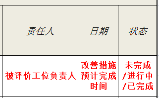 整张表单不可以有空的地方:评价发现栏填写见下述、责任人栏填写为被评价工位的负责人、日期栏填写为改善措施的预计完成日期、状态栏填写为此改善措施的完成进度,如未完成、进行中、已完成,如图3-3所示。