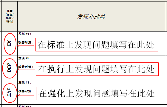 写评价发现,若是在标准上发现问题,对应评价发现前选择“EX”;若是在执行上发现问题,对应评价发现前选择“DEP”;若是在强化上发现问题,对应评价前选择“ENF”,如图3-4所示。
