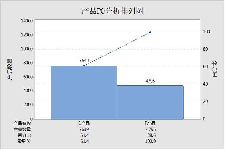 统计日期最少为三个月或半年,如果每日生产无数据,入库数据或出货数据均可以纳入分析的范畴。根据数据收集表,可以得到D、E产品族的生产PQ数量状况,可以做成排列图来决定采用哪个具体的产品做现状的VSM价值流程图分析。依表7-3的数据可生成图7-3的PQ排列图。