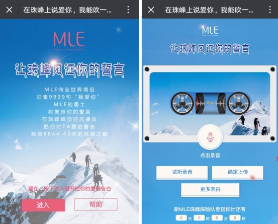 消费者购买MLE钻戒,即可把爱的誓言录音,由MLE统一整理后放在特制的播音设备,交给专业的登山团队爬上珠穆朗玛峰,播放大家的爱情誓言。这就是“海誓山盟”场景中的“山盟”。