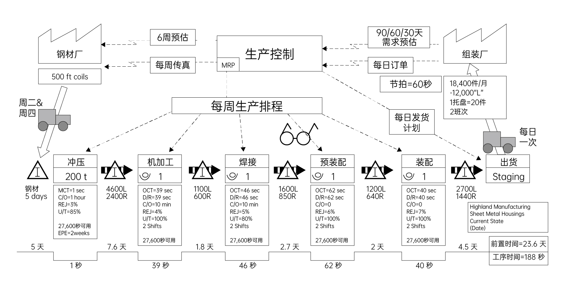 价值流图是一种精益企业的方法,用于记载、分析和改进为客户生产产品或提供服务所需信息流或物流。如图7-9所示。