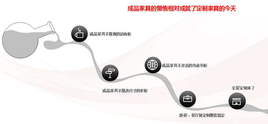 大家都知道,当时做板式家具的核心命脉就是卧房,而卧房的灵魂就是床和衣柜!衣柜直接被定制抢走了,卧房里其他的东西被抢走,也是指日可待了。定制家居的发展路线如图3-1所示。