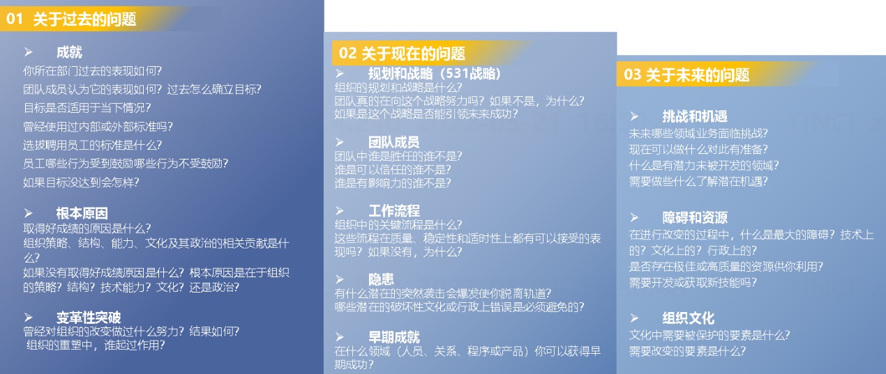 过去的信息包括组织以往的成绩、获得成绩的原因、重要突破的历史。过去的信息的了解,有助于新任干部了解组织的历史、能力强项及过往的成功经验,在业务决策中可以快速选择与组织能力长板相匹配的方向,提高决策的有效性。