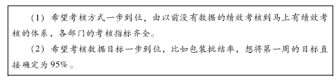 :变革前,企业的人希望考核数据目标一步到位。就拿刚刚讲到的包装批结率为例,原来的基础数据是20%,定考核目标的时候,管理人员想将第一周的目标就定为95%。