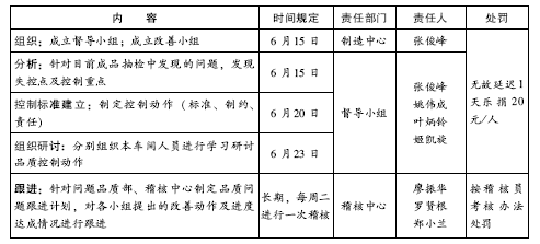 (2)过程奖惩:根据改善结果,由总督导人每周评出“品质改善之星”,报总指挥审批,对小组组长奖励50元/人,小组成员奖励20 元/人(在各工序品质考核目标未确定之前暂不实施)。