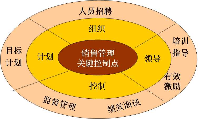 销售管理泰斗罗伯特·凯文(罗伯特·卡尔文?)认为,销售管理应该被看作是一个流程,计划P、组织O、领导D、控制C是管理的一个闭循环,这一流程的各个环节都有影响业绩的关键控制点,这些关键点分别是:①目标计划、②人员招聘、③培训指导、④有效激励、⑤监督管理、⑥绩效面谈。当销售经理根据这六个关键点建立标准化的管理模型、工具和方法时,将真正实现销售管理从粗放向精细的转变,就能应对未来任何环境的挑战,大幅度提升销售团队的绩效。