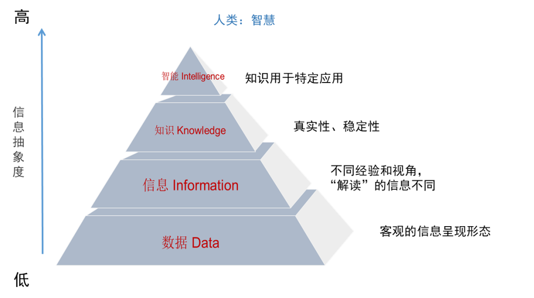 知识的抽象程度比信息更高,同时具有更强的稳定性和可靠性。知识可以来自于数据分析的结论,也可以通过人工录入编辑的方式产生。前者所提及的知识是需要探索的未知的新数据,后者知识是人们在生产生活实践中已经掌握的知识。