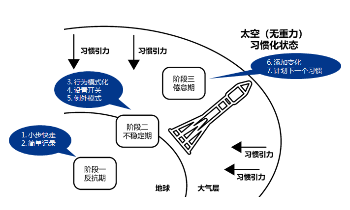 在《坚持,一种可以养成的习惯》一书中,作者将习惯的养成比喻为阿波罗11号的发射过程,如图7-9所示。