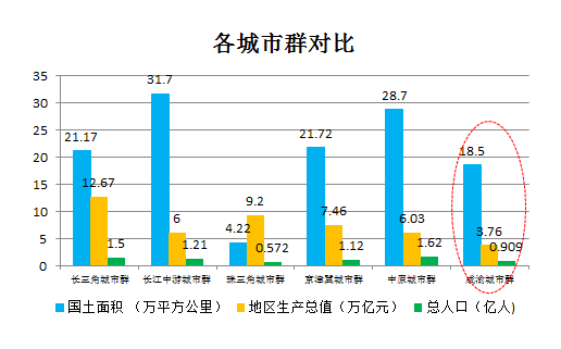 成渝城市群国土面积18.5万平方公里,占全国的1.92%;地区生产总值3.76万亿元,占全国的5.05%;常住人口9094万人,占全国的6.57%。